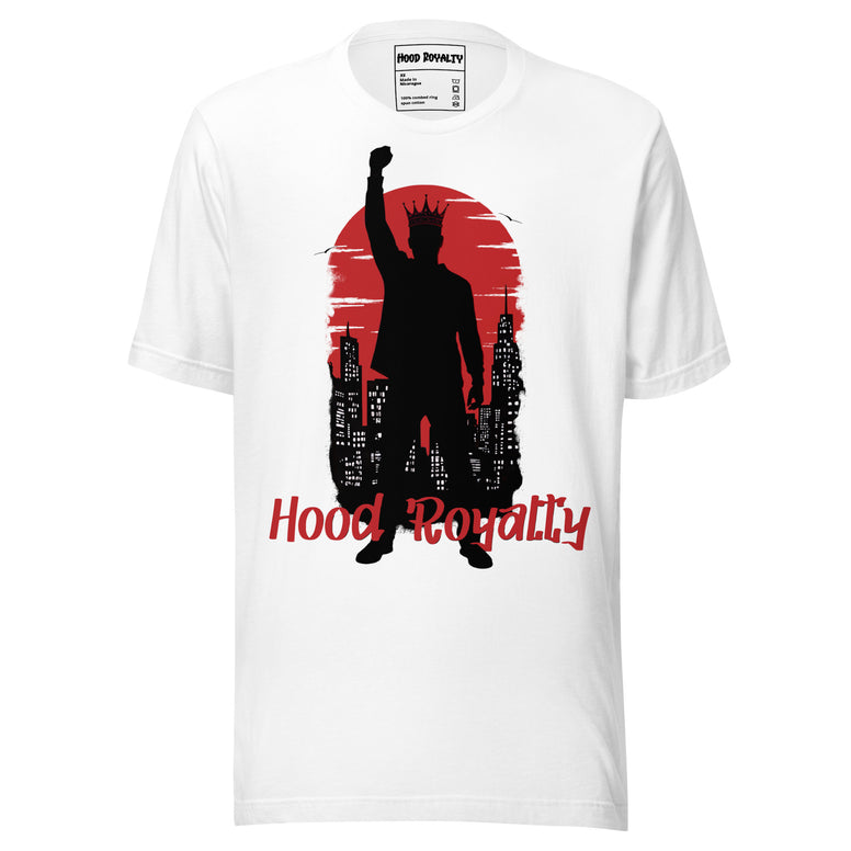 Stand tall in your power with the Hood Royalty Power Tee — a fearless symbol of pride, resilience, and legacy. Featuring the silhouette of a crowned king rising from the city skyline against a blood-red sun, this design captures the heartbeat of the streets and the strength of self-made royalty.